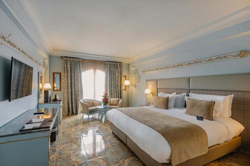 Cette chambre single deluxe offre un espace confortable et élégant, idéal pour un séjour individuel. Elle dispose d’un lit confortable, d’un bureau fonctionnel et d’une salle de bains privative équipée d’une douche ou baignoire. La décoration moderne et chaleureuse assure un cadre reposant après une journée à Marrakech.